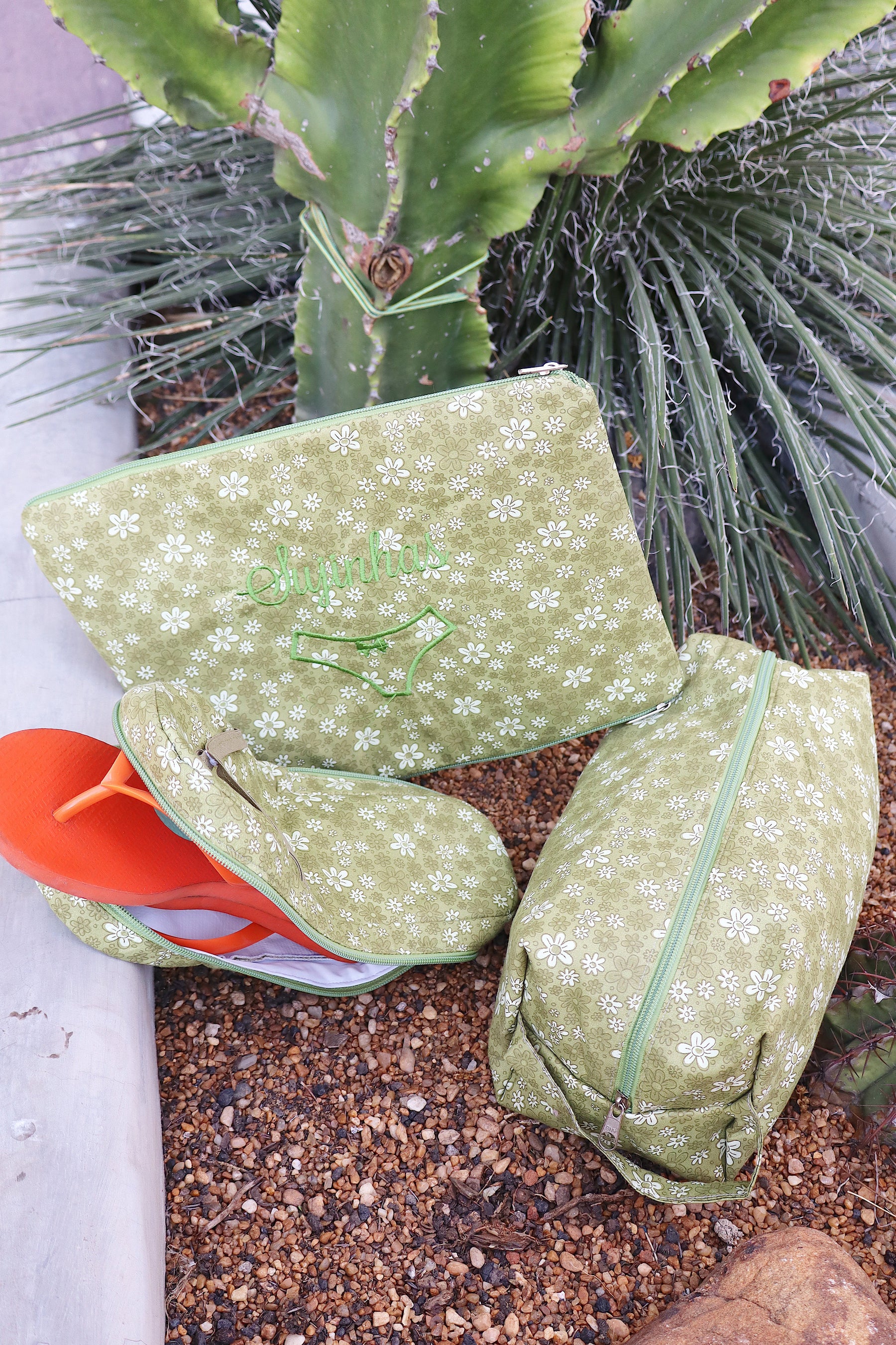 Kit Viagem Necessaire Box + Sujinha Limpinha Porta Calcinha + Porta Chinelos Florzinhas Verde